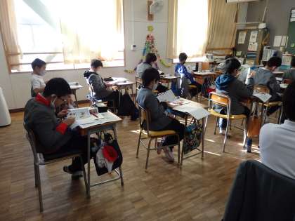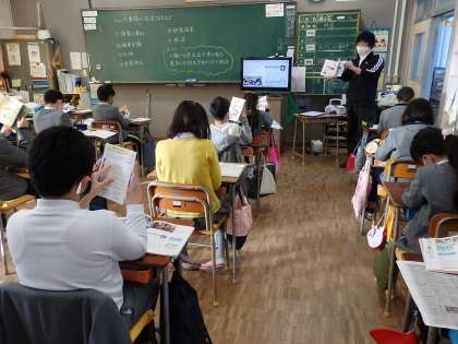 社会の授業です。今年は、新型コロナのために、社会科見学で放送局に行くことはできませんでしたが、いただいた資料を参考にしながら、放送局などの情報を発信するマスコミについての学習が始まりました。