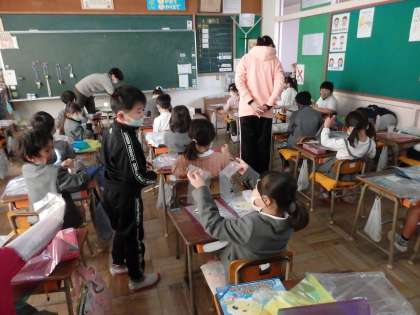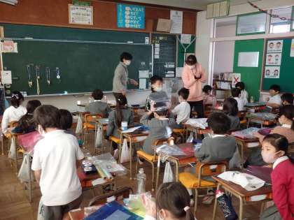 図画工作の授業です。これから学習に入る単元の、個人持ちの教材が全部揃っているか、先生と一緒に確認しています。