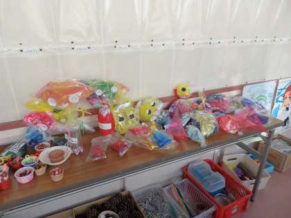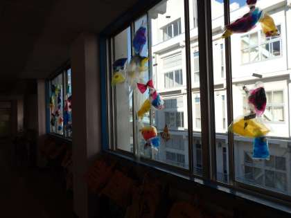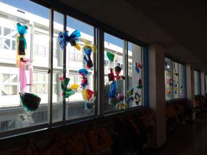 1年生が、図画工作の授業で作った作品が、廊下に展示されていました。
