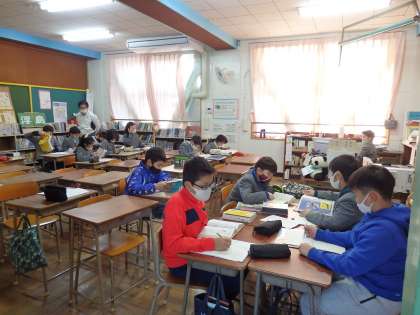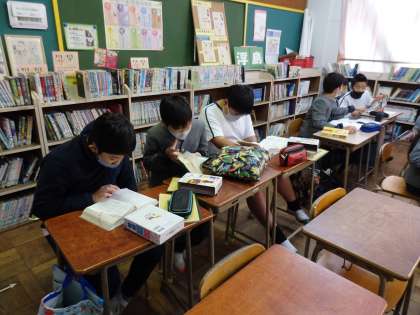 国語の授業です。「ことばについて調べよう」の単元で、いよいよ調べ学習に入りました。図書室の国語辞典も利用して、個人で黙々と取り組んでいる子や、アイディアを伝え合いながらグループで調べている子がいます。
