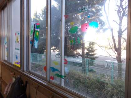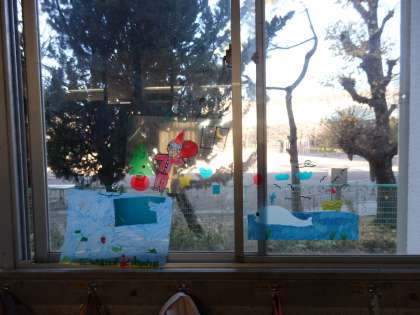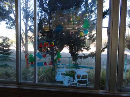 4年生の廊下の窓に、クリスマス飾りが貼り付けられていました。