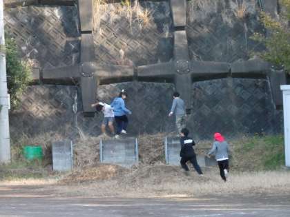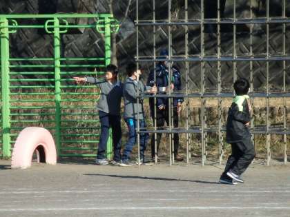 運動場で鬼ごっごをやって、楽しんでいます。