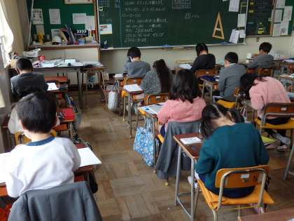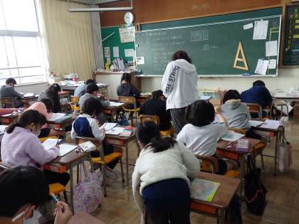 算数の授業です。問題をやって、できたところまで先生に点検してもらっています。