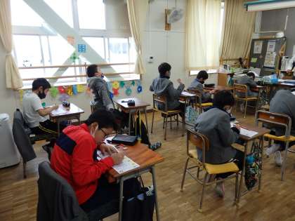 国語の漢字ドリルを中心に、ドリル学習をしています。終わった子は、読書です。