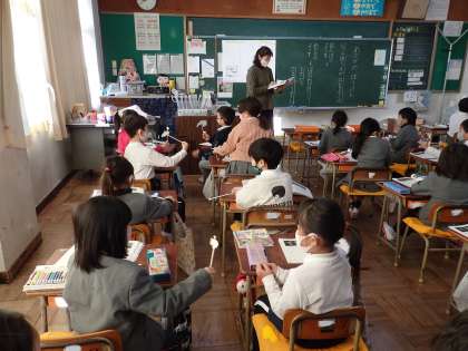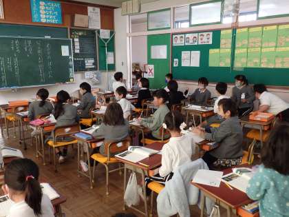 国語の授業です。読み取り教材の学習です。先生の音読に合わせて、紙で作ったメダカを動かして内容の理解を進めています。