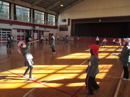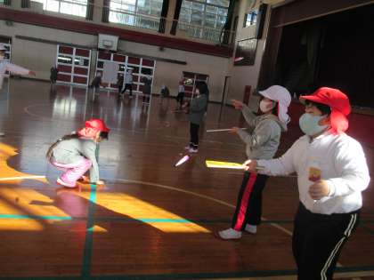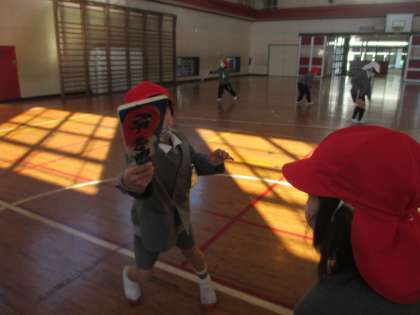 1年生が作ったたこと2年生が絵付けをした羽子板を使って、「昔のあそび交流会」をしました。