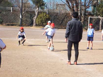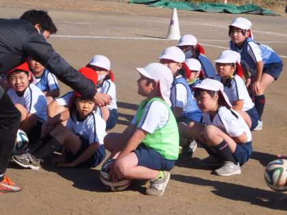 まず始めに、1・2年生です。子供たちの中には、サッカーをやったことがない子もいましたが、コーチの明るく元気いっぱいの指導で、どの子も、一生懸命に動いていました。
