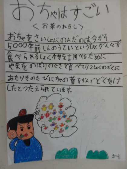 3年生は、授業参観で、総合的な学習で調べたお茶について、グループ別に発表しましたが、別に作成した掲示が廊下に貼られていました。