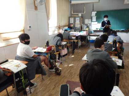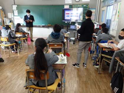 英語の授業です。登場人物の話を聞き取って、出てきた内容を確認しています。