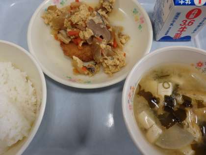 今日は、食欲をそそるカツ丼です。みそ汁も、具だくさんで、食べ応えがあります。
