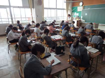 国語の授業です。物語の読み取りで、自分の考えをノートに書いています。