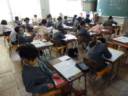 書写の授業です。先生と作業する内容を確認しています。