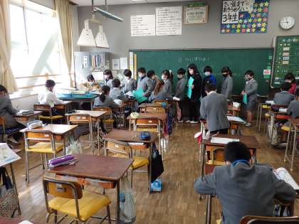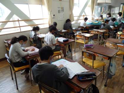 国語の授業です。テストの直しをしたら、先生に点検してもらっています。