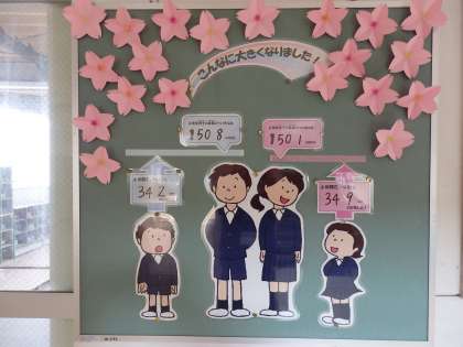 運動場側の玄関の脇に、6年生が6年間でどのくらい身長が伸びたかの掲示をしました。