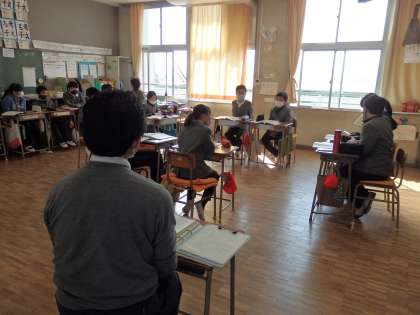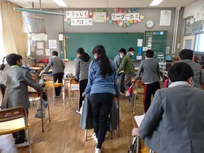 国語の授業です。模擬討論会を終え、座席を戻したら、まとめに入ります。