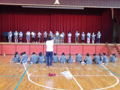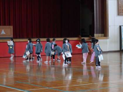 国語の授業です。体育館で、物語の音読発表を行っています。