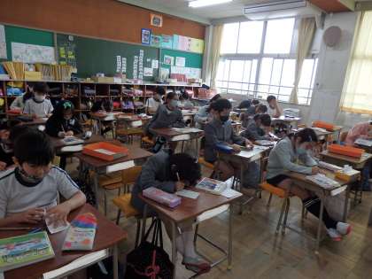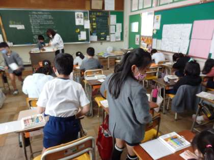 国語の授業です。葉書に、今年あった出来事を書く学習です。