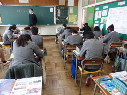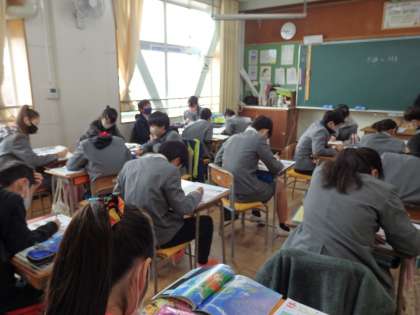 社会科の授業です。学習プリントに取り組んでいます。個人で取り組んだり、グループになって取り組んだりしています。