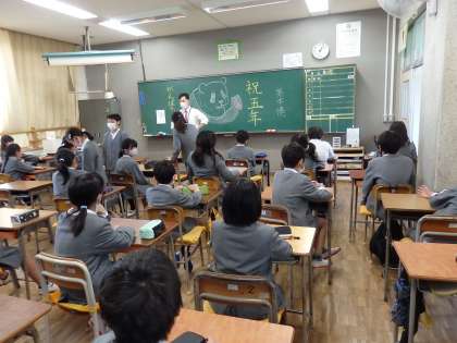 高学年になって分けられるたくさんの教科書を取りに行って、教室に戻ってきたら、新しい先生の話を聞きます。