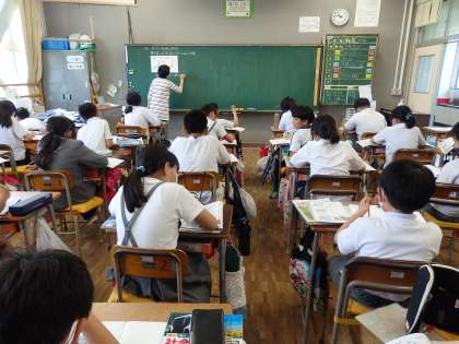 社会科の授業です。日本の国土と気候の学習で、気がついたことを発表しています。