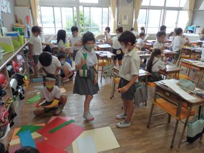 図画工作科の授業です。輪っかをつくって、変装を楽しむ授業です。