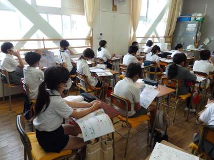 家庭科の授業です。返してもらったテストをもとに、学習のポイントを再確認しています。