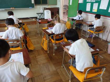 国語の授業です。1学期の最後に学んだ物語教材のテストをしています。終わった子は、先生にすぐに採点してもらっています。
