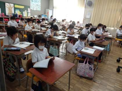 国語の授業です。先生が音読する教科書の本文を目で追いながら、静かに耳を傾けています。