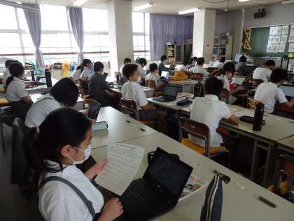英語の授業です。自分の一日の生活について書いた原稿を、コンピュータを使って、音声入力しています。画面を見ながら、正しく発音できているか確認しています。