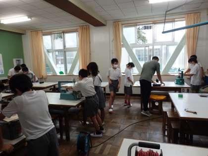 図画工作科の授業です。仮面づくりをしています。今回は、糸のこを使って立体作品を制作していきます。