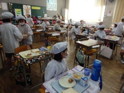 画像は、配膳の終わりを待っている2年生の子供たちの様子です。