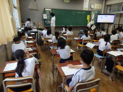 算数の授業です。先生と、今日みんなで考えていく学習課題を確認しています。