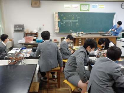理科の授業です。てこの原理の学習をしています。「作用点」「支点」などの用語を確認して、実験を始めます。