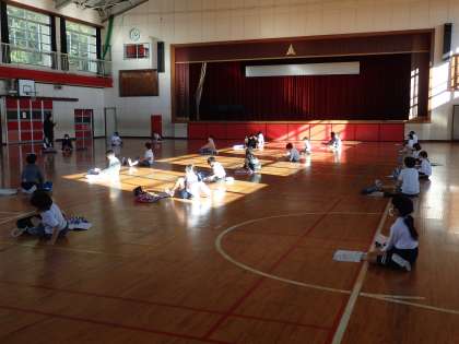 音楽の授業です。体育館に移動して、リズムを取る練習をしています。それが終わったら、鍵盤ハーモニカを使ってみます。