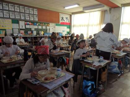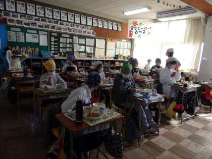 2枚目の画像は6年1組の食事風景、3枚目の画像は6年2組の配膳風景です。給食時に係活動がある子がいるので、早めに食べている子たちもいます。