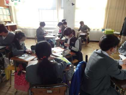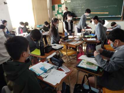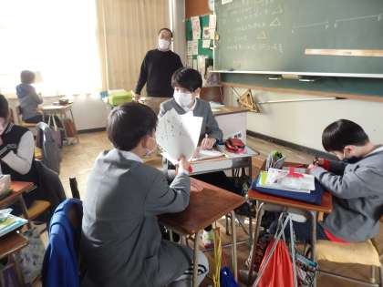 算数の授業です。三角形の拡大図と縮図を、マス目のない紙にどのようにしたらかけるか、自分の考えをもとに、グループで話し合って考えていきます。
