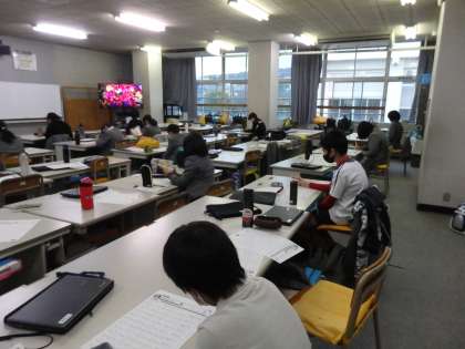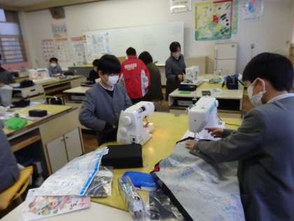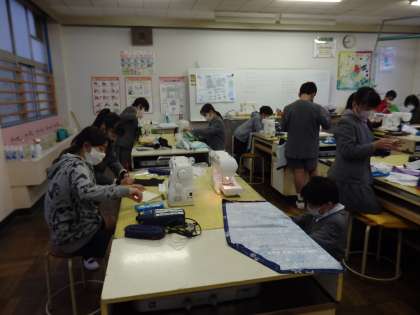 一つのグループは、家庭科室で、ミシンを使いながらエプロンの製作に取り組んでいます。