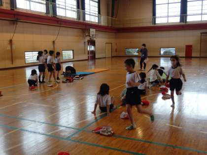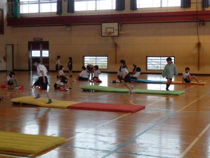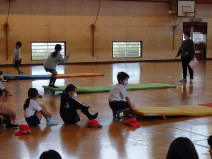 体育の授業です。マット運動で、前転に取り組んでいます。
