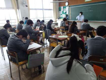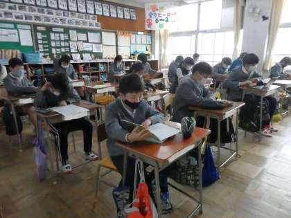 家庭科の授業です。テストに取り組んでいます。終わって提出した子は、読書をして静かに過ごしています。