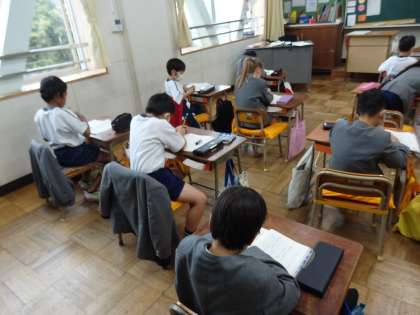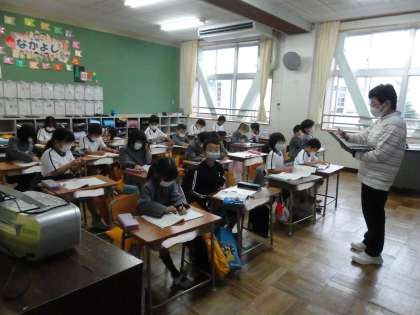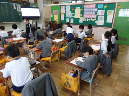 国語の授業です。今日は、「、」や「。」「」(かぎかっこ)使う練習をしています。