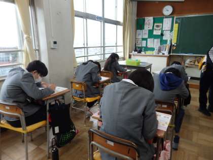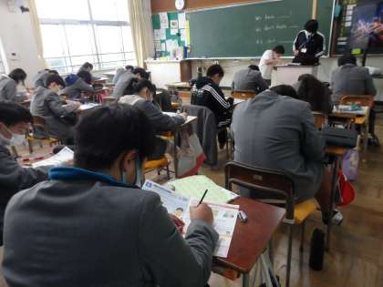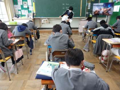 英語の授業です。ワークブックを使って、今まで習ってきたことを復習しています。
