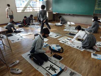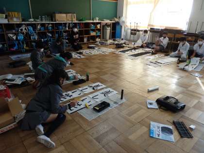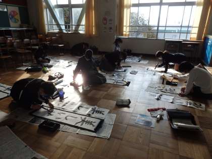 書写の授業です。本来の教室を中心にして、いくつかの部屋に分かれて、書き初めの練習をしています。