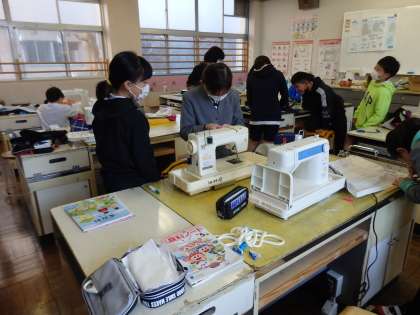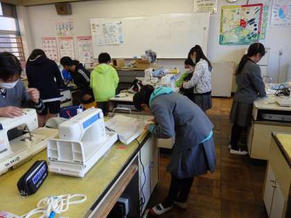 家庭科の授業(1枚目、2枚目)では、ミシンを使って、エプロンを作っています。