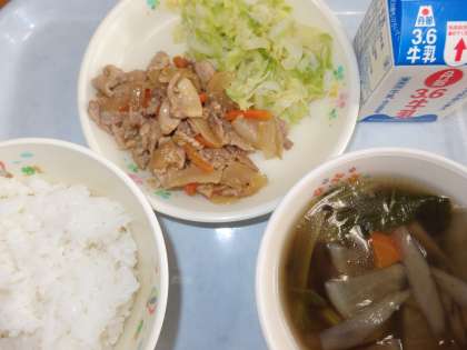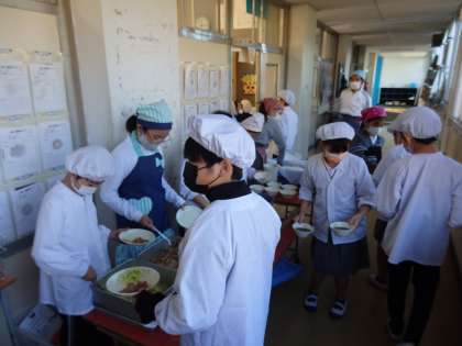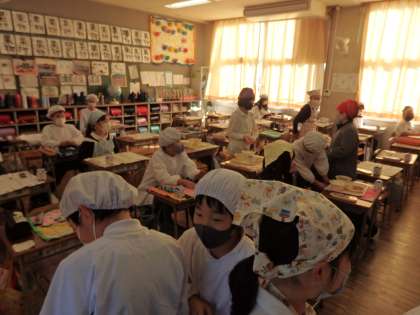 2枚目と3枚目の画像は、配膳をする4年生の様子です。