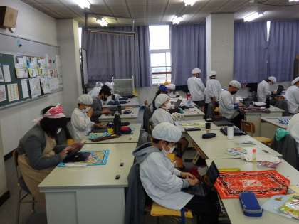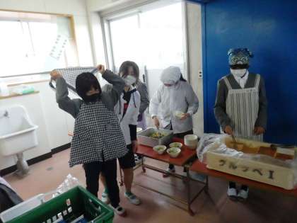 2枚目と3枚目の画像は、給食の配膳の準備を始めた5年生の様子です。