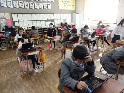 算数のテストをやっています。提出した子は、AIドリルを利用して黙々と復習をしています。