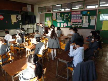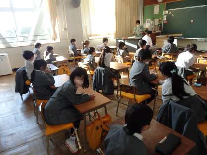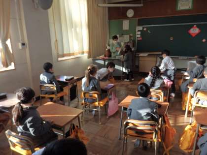 先生が、一人一人にコメントを伝えながら、成績表を渡しています。他の子たちは、静かに待っています。