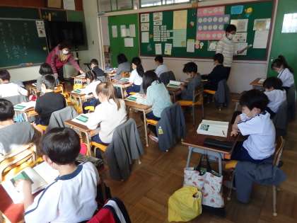 国語の授業です。先生と一緒に、教科書の物語文を音読しています。途中、先生の指示で、本文に赤鉛筆で印をつけたりもしています。
