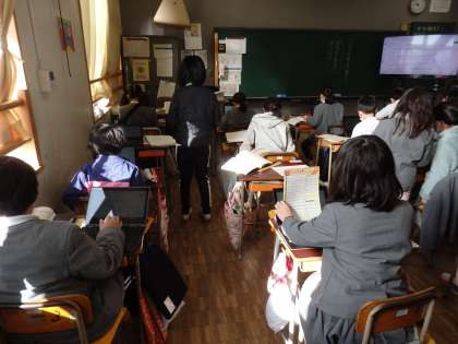国語の授業です。コンピュータの画面に映し出されている視点にしたがって、自分で説明文を書いています。ローマ字で入力するのも、だいぶ速くなってきました。