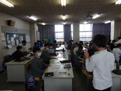 国語の授業です。テストを返してもらっています。テストを受け取ったら、テスト直しを行います。